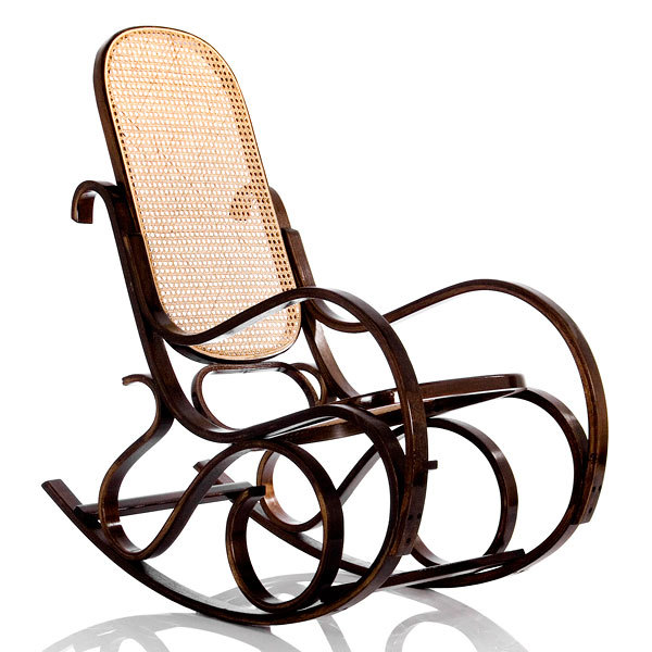 Кресло-качалка с циновочным плетением из ротанга на спинке и сидении.